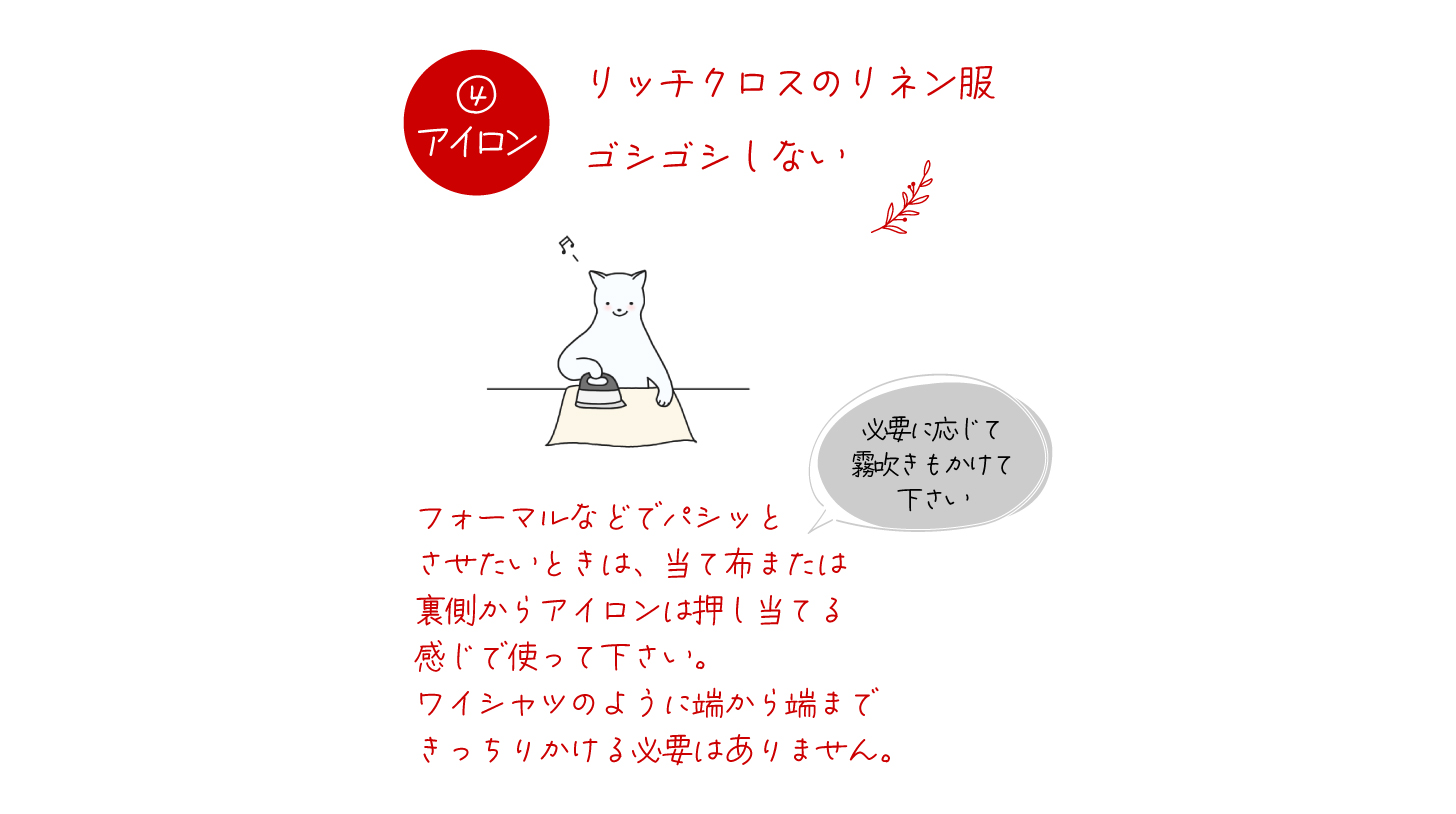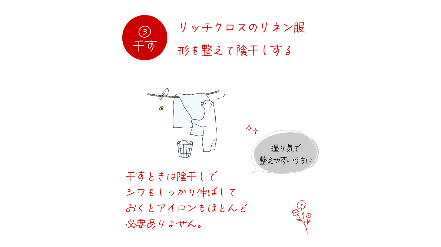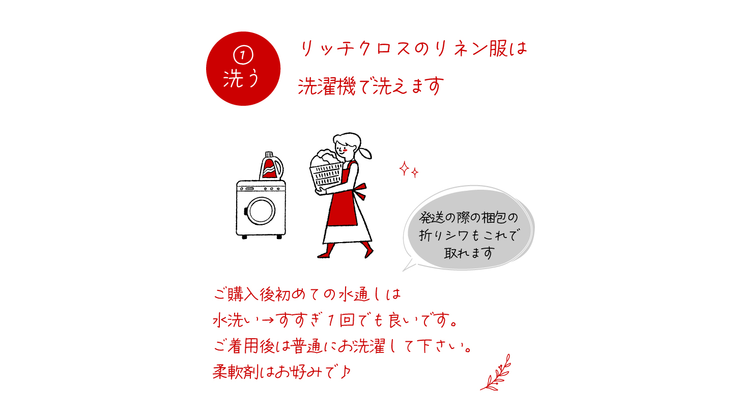 脱水1,2分でシワを伸ばして干すとふんわりナチュラルな仕上がりになります ほぼノーアイロンで大丈夫です。毎回どんな風に乾くのか楽しみになります♪ それから丈夫なリネンも日光に当たると変色するため、日陰または室内に干すようにしましょう。